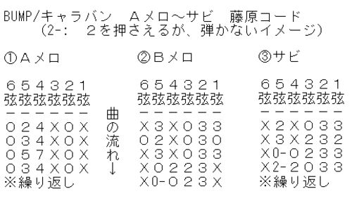 BUMP OF CHICKEN新曲カップリングの「キャラバン」 最速耳コピシリーズ。 AメロからBメロ、サビへの藤原コードじゃよ。一本のギターは、ずっとコードストロークをしてるように聴こえる。Aメロに重なるアルペジオは、イントロパターンとほぼ同じじゃな。 …